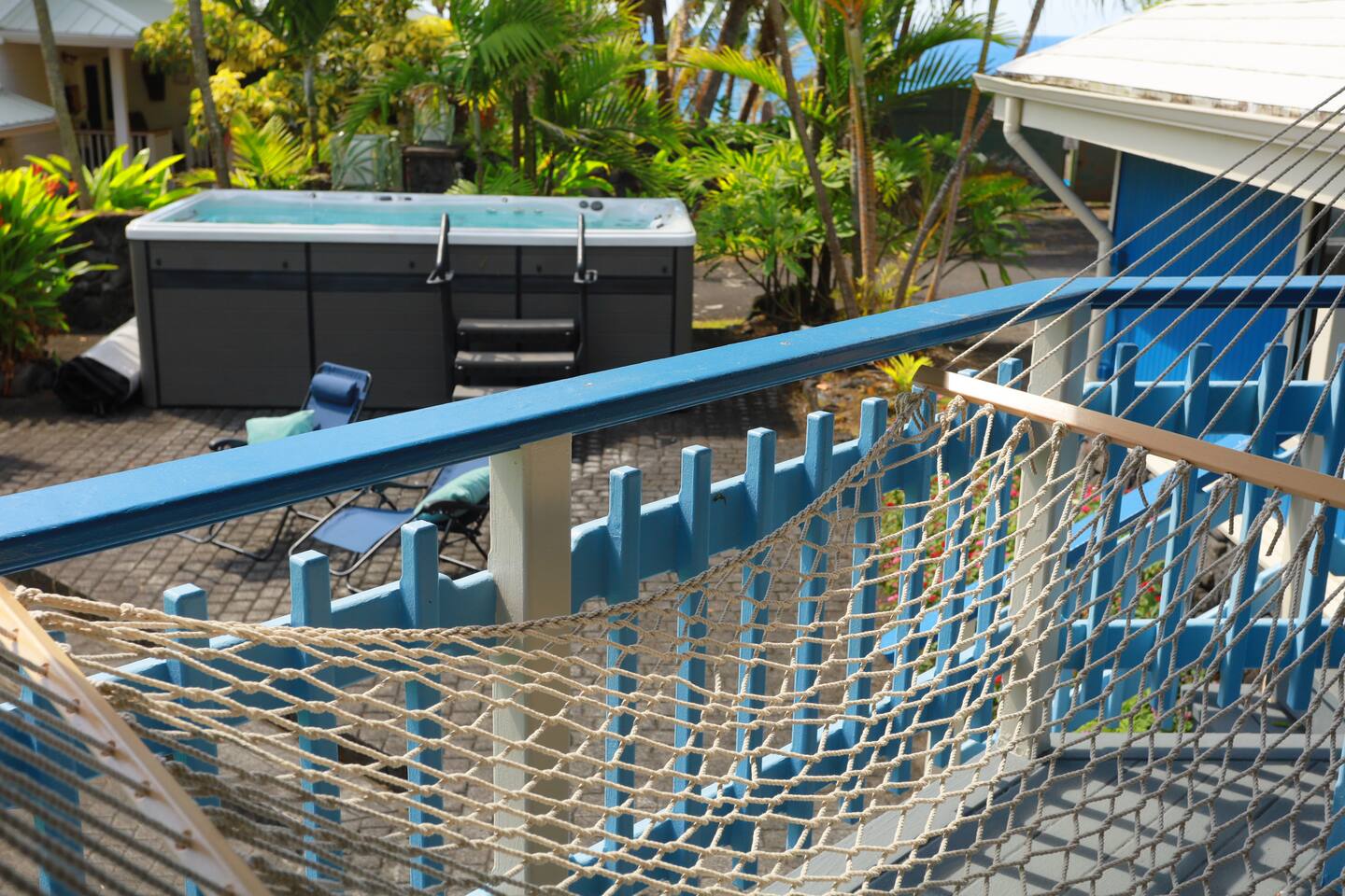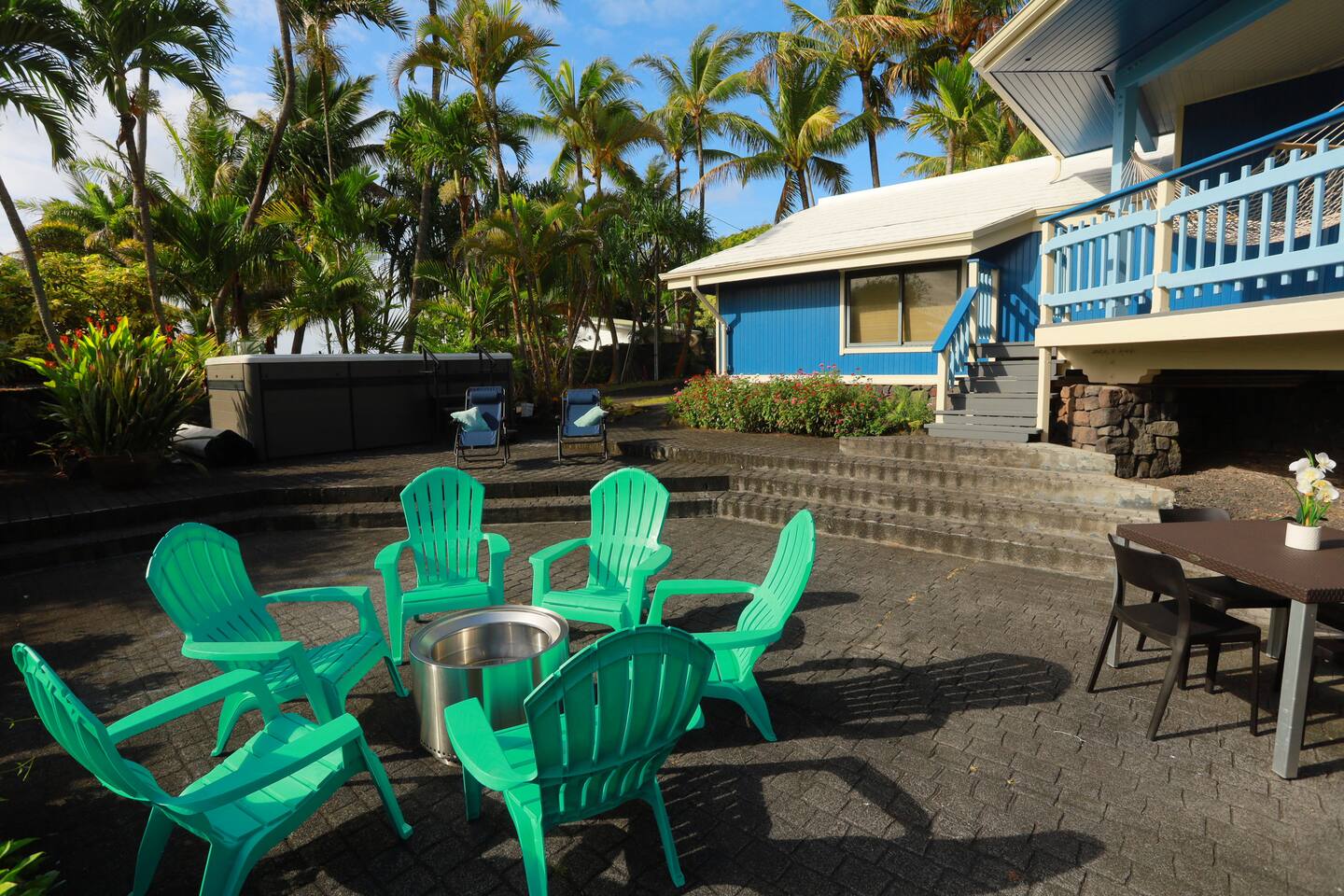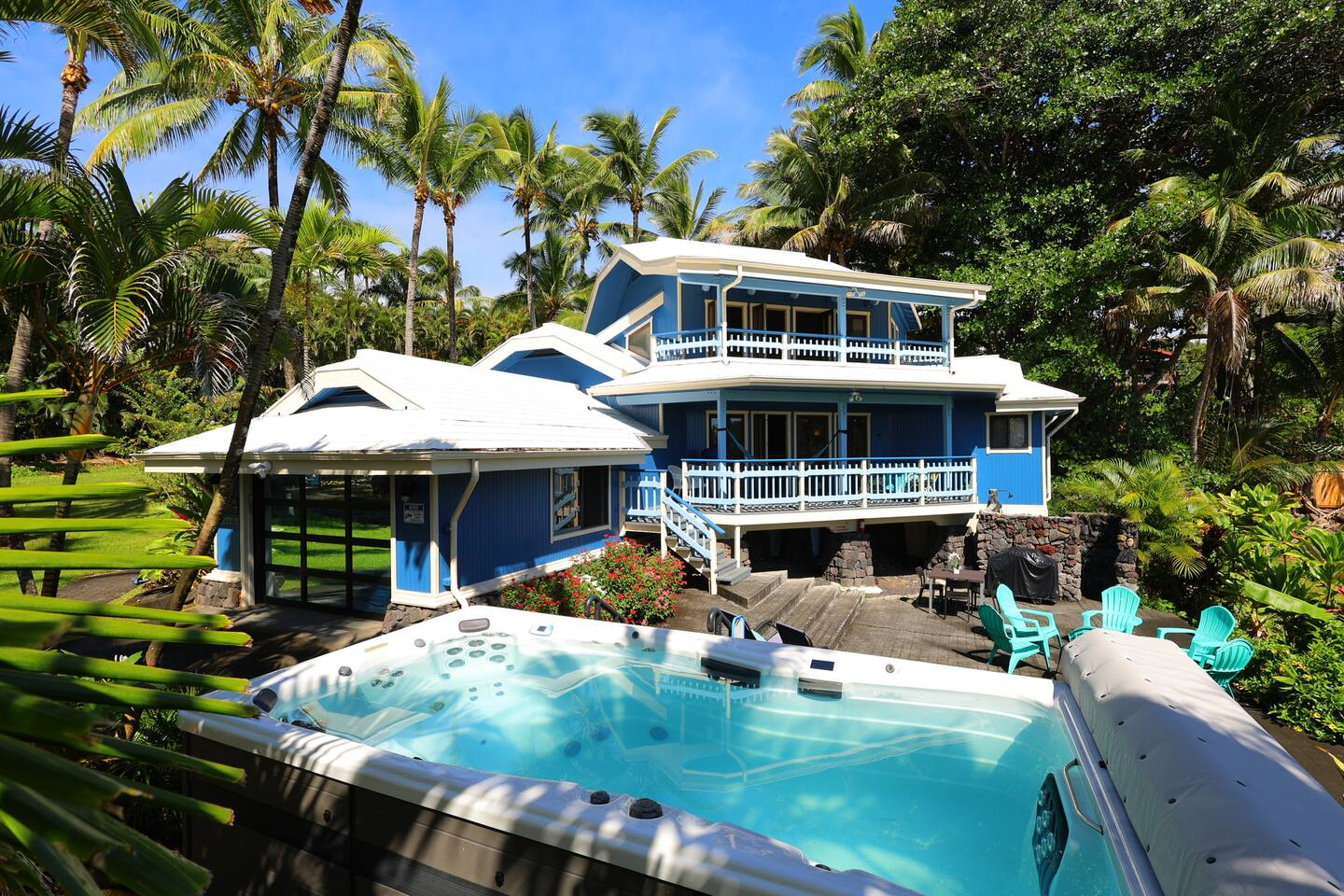 Hear and see the ocean out your bedroom balcony. Three-minute walk out your door and you're barefoot on Kehena's smooth black sand, surrounded by dolphins and Sunday drum circles. This is the Hawaii nobody talks about — the raw, wild, magical side where geckos scamper, coqui frogs chirp you to sleep -- then you wake up to gentle sounds of palm fronds and crashing waves. Pure Puna paradise. 🌊 YOUR OCEANFRONT SANCTUARY The Experience: Wide-open bifold doors frame endless ocean views. Watch sunrise from your master bedroom balcony. Fall asleep to waves. This bungalow is designed for indoor/outdoor living — ocean breezes flow through, ceiling fans keep you cool, and the jungle surrounds you in tropical luxury. There is no air conditioning here but you won't miss it. Puna rains and trade winds keep temperatures remarkably comfortable, usually cooler than Kona. Keep the air flowing and embrace the rhythm of eastern Big Island. Perfect for: • 1-3 couples and friends seeking adventure and relaxation • Families who want real Hawaii (not resort Hawaii) • Anyone ready to disconnect and experience Puna's wild beauty 🏠 INSIDE THE BUNGALOW Living Spaces: • Three spacious decks (upstairs balcony, downstairs deck, screened private lanai) • Open-concept living room with 65" TV (Disney+, Hulu, ESPN+ — bring your own streaming accounts) • Fully equipped kitchen (cookware, dishes, coffee/tea) • Garage/den with washer/dryer, mini ping pong, beach gear Bedrooms (sleeps 8): • Master Suite (upstairs): King bed + full futon, private balcony with ocean views, ensuite bathroom with soaker tub, 50" TV • Guest Suite (downstairs): King bed, private bedroom • Living Room: Two Cordaroy bean bags that convert to double mattresses (bedding in closets) • Outdoor Lanai: Queen convertible sofa (screened, sheltered — perfect for "glamping" in the jungle) • Garage/den: Queen futon. Not official "living space," but available if anyone needs privacy. Bathrooms: • Master ensuite (upstairs) - standalone shower and oversized soaking bathtub • Full bath with shower (downstairs) 🏊♂️ SWIM SPA & OUTDOOR LIVING Your Private Oasis: The swim spa is set to 90°F — use it either as a plunge pool or hot tub. After a day of hiking volcanoes, swimming at Kehena, or exploring waterfalls, sink into the spa under starry Hawaiian skies. Fire pit brings everyone together for evening storytelling. Outdoor Amenities: • Heated swim spa (huge hot tub or plunge pool) • Fire pit ready for smores and stargazing (huge solo stove -- bring your own firewood) • BBQ grill • Hammock for lazy afternoons • Screened outdoor living/glamping space 🏖️ KEHENA BLACK SAND BEACH (3-MINUTE WALK) Hawaii's Best-Kept Secret: Walk 500 feet out the door to the beach parking lot, then take the footpath down to paradise. Kehena's coarse-grained black sand feels like a luxury spa treatment. Dolphins visit regularly. Strong swimmers love the waves. Families splash in the shore break. Sunday Drum Circles: Every Sunday, Kehena comes alive. Locals gather for an epic drum circle that starts around noon and lasts until sunset. This is Puna culture at its peak — music, dance, community, and pure aloha spirit. Note: Kehena is informally clothing-optional (~10% of beachgoers are nude). Everyone is respectful and families are welcome. The waves can be strong — supervise kids and swim only if you're confident in the water. 🌋 NEARBY ADVENTURES Right on Your Doorstep: You're in Puna — Big Island's "wild east." This is where lava meets the ocean, hot springs bubble up, and Hawaiian culture thrives away from the tourist crowds. 🔥 TOP EXPERIENCES: • Pohoiki Hot Ponds & Black Sand Beach (15 min): Isaac Hale Beach Park has Hawaii's only public "hot springs" — volcanic-heated brackish water. Pohoiki Beach is the youngest black sand beach in the world. Surfers love it. • Kalapana & Uncle Robert's Awa Bar (10 min): Wednesday nights = live Hawaiian music and dance. Local bands, food trucks, kava bar, and the beating heart of Puna culture. Saturday mornings bring the Kaimu farmers market — fresh coconuts, ahi, ono, and Big Island vibes. • Kalani Resort (5 min): Epicenter of Puna's "ecstatic dance" community. Sunday yoga + zen-EDM dance parties, followed by beach gatherings and sunset music at Seaview. This is Puna at its peak. • Hawaiian Volcanoes National Park (45 min): See Kilauea crater, hike lava tubes, and if you're lucky, witness an active eruption. Best viewed at night! Chain of Craters Road (15 min from the south entrance) offers coastal hikes along ancient lava flows. • Hilo Waterfalls & Town (45 min): - Rainbow Falls, Wai'ale Falls, Boiling Pots - Ola Brew (best burgers + craft beer) - Cafe Pesto (upscale Italian) - Richardson, Carlsmith, Onekahakaha beach parks (calm water, sea turtles, snorkeling) • Epic Day Trips: - Akaka Falls (442 ft waterfall, 1h) - Waipio Valley Overlook (1h25) - Punalu'u Black Sand Beach + Green Sand Beach + South Point (1h30-2h) - Mauna Kea Observatory (2h — 4WD required for summit) • Pahoa Town (25 min): The "wild west" of Hawaii. Malama Market (groceries), great restaurants (Tin Shack, Kaleo's, Ning's Thai, Pho 19), and Friday/Saturday night live music in coffee shops, bars, and dress shops. Way more than meets the eye. 📍 WHAT MAKES PUNA SPECIAL This isn't Waikiki. This isn't Kona. This is *real Hawaii* — remote, raw, and unforgettable. ✓ Black sand beaches with dolphins ✓ Volcanic hot springs ✓ Sunday drum circles ✓ Lava flows you can hike ✓ Dozens of waterfalls ✓ Jungle living with ocean breezes ✓ Hawaiian culture (not tourist culture) ✓ Ecstatic dance, live local music, farmers markets 📍 IS THIS HOME RIGHT FOR YOU? Our bungalow is *perfect* for: ✅ People who've already done the resort/condo thing (Kona, Waikiki, Kihei, Poipu) and want REAL Hawaii ✅ Anyone who wants to see Hawaiian Volcanoes National Park AND be next to a beach. ✅ Kama'
