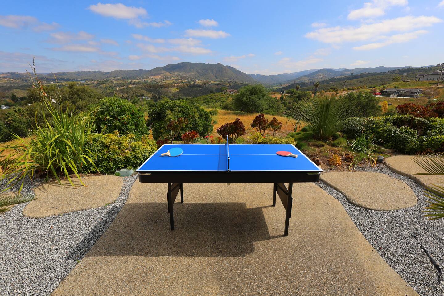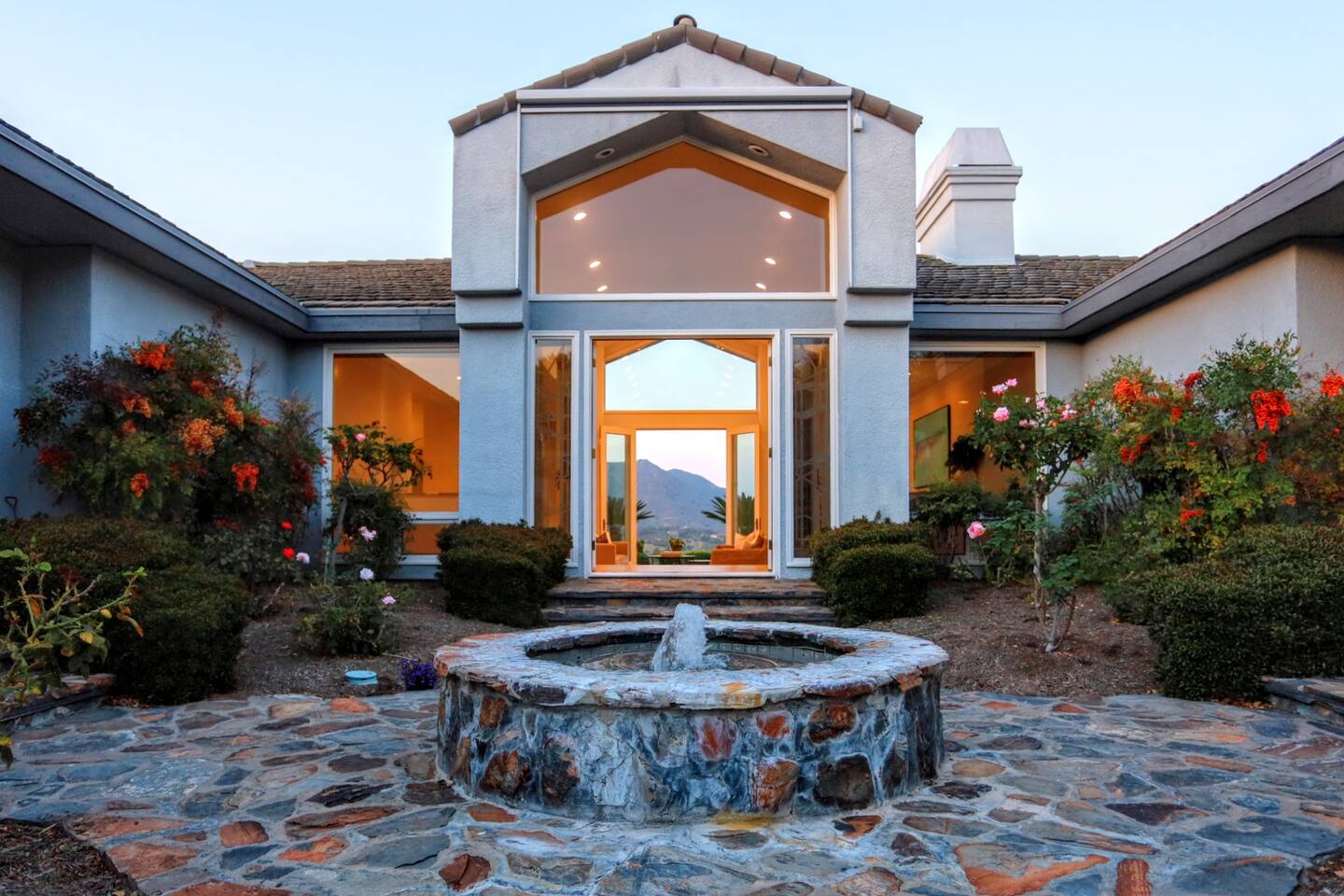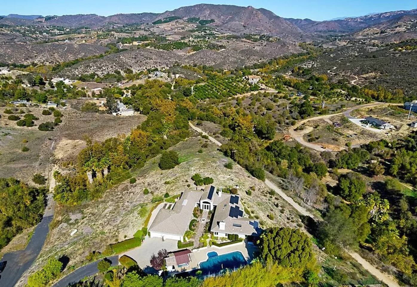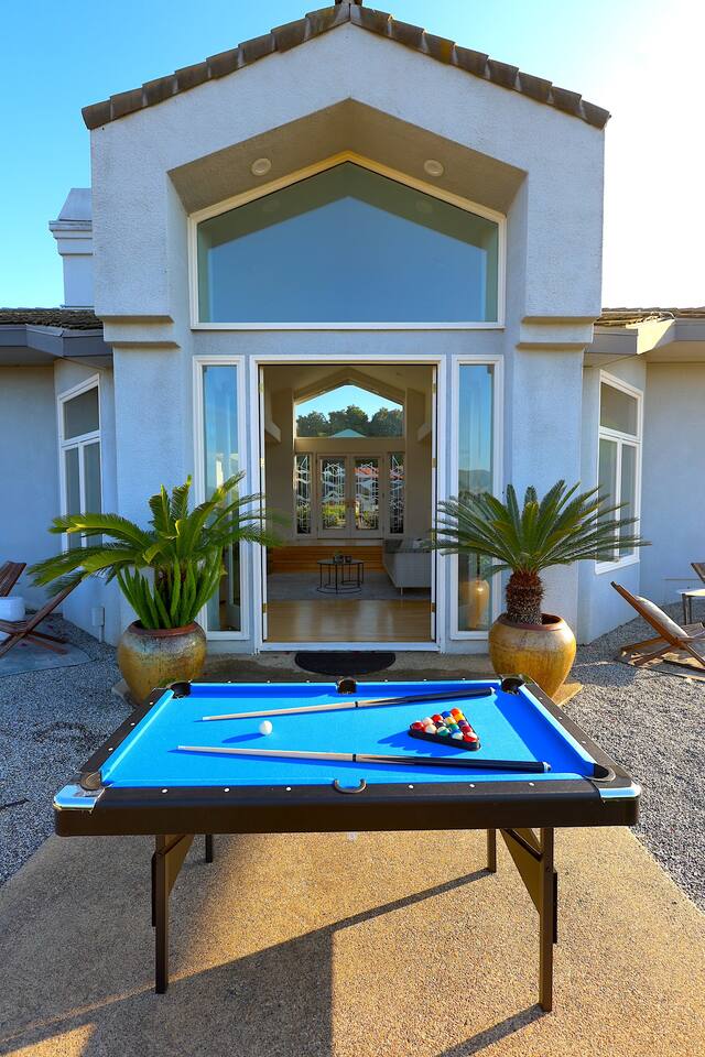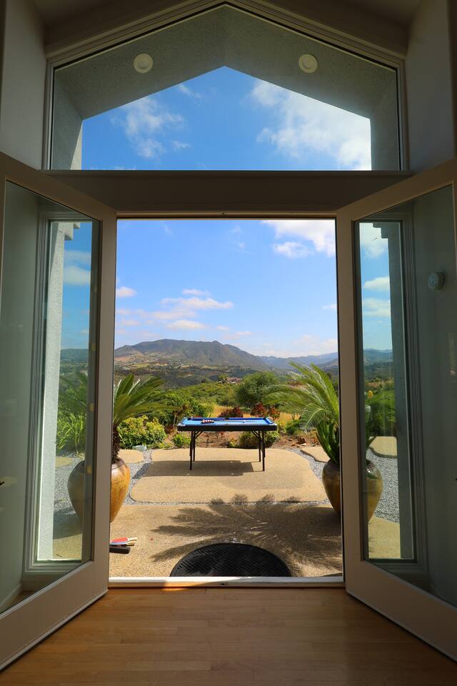 Pick fresh citrus from the orchard for your morning juice. Practice yoga in our expansive living room with panoramic views of the De Luz mountains. Lounge in the sun by our sparkling pool, surrounded by palms and plumeria. Step out your door onto the Santa Margarita River Trail, with blooming wildflowers, shaded riverbanks and hidden truffles. Toast marshmallows in the backyard chiminea as the sun sets. Fallbrook is one of Southern California’s last rural enclaves. Secluded and stunning, yet still close to everything -- wine tours, beach days, hiking, golf and pickleball, or a trip to the city. ★ WHAT MAKES OUR HOME SPECIAL • Château-inspired architecture by Colbourn Currier Noll with sunlit Versailles-style courtyard • Half-Olympic heated saltwater pool + oversized 10-person spa (both heated free) • 3,800 sq ft estate on 4 private acres surrounded by citrus and vineyards • Chef’s kitchen: 6-burner range, double ovens, Sub-Zero fridge, wok + grill • Direct access to the Santa Margarita River Trail • Ideal for weddings, wine weekends & multigenerational retreats 🏡 THE ESTATE Bedrooms (up to 15 overnight guests): • Master: King bed, optional queen bean bag + crib | 800 sq ft bathroom (bridal prep dream) | tropical palm garden and pool views • Bedroom 2: Two queens + optional bean bag | En-suite bathroom | 65" Frame TV | valley views • Bedroom 3: King + queen Murphy bed | En-suite bathroom | garden and valley views • Bedroom 4: Full-over-queen bunk (top: 1 person, 180 lbs max) | private bathroom | valley views • Living room: Two queen bean bag beds | 85" Frame TV | ultimate panoramic views Living & Entertaining: • Open living/dining with French doors to front courtyard, back yard with panoramic mountain views. • Indoor dining for 12+ • 85" and 65" TVs (Disney+, Hulu, HBO Max) • Board games and toys • 3 gas fireplaces (please ask before lighting) Outdoor front yard and pool: • 5,000 sq ft poolside patio with loungers, canopy daybed, tropical palms • Outdoor dining for 12+, gas BBQ grill and outdoor kitchen under the lanai • Ping pong, pool table and lounge under our sheltered wisteria lanai Outdoor back yard: • Gas chiminea and chair circle for cozy evenings, fireside chats and s'mores • Mature orange and lemon trees (pick as much as you like) • Large open space for ceremonies • 4 acres for exploring • Hiking & mountain biking trails at your door, leading to the Santa Margarita river. Sustainability: • 40 kW solar & electric pool heat pump • EV charger - free and convenient for your use 🏊 POOL & SPA Our half-Olympic size lap pool is larger than most hotel offerings, and stunning when sparkling in the sun. Saltwater feels soft compared to the ocean or chlorine pools -- perfect for soaking away stress. The pool is regularly 80–85°F in summer and fall, and heated free to a refreshing 75°F in winter. Our adjacent 104°F spa — as big as many plunge pools and seating 10 — is available for warm-ups. Additional pool heating above 75°F is available for $40/degree with advance notice. 💍 WEDDINGS & EVENTS With its panoramic vineyard and valley views, expansive back yard space and formal courtyard, the estate is perfect for intimate weddings and celebrations. • Up to 60 guests, 12 vehicles maximum • Bridal prep: 800 sq ft master bath • Ceremony: front courtyard or huge open back yard with panoramic views • Receptions: back yard (60 people), poolside or under lanai (30 people), or open up the living room doors on both sides (30 people). • No charge up to 30 guests, $50/person for 31-60 • Quiet after 9 PM, no outdoor music without approval Close to Grand Traditions, Monserate Winery, Los Willows Wedding Estate for larger ceremonies. Many use our villa for wedding party lodging. Connect us with your wedding planner or ask us for catering recommendations. 🍷 WINE COUNTRY GETAWAYS, BACHELOR & BACHELORETTES It's like a California edition of "The Great Gatsby" -- luxurious, private and sophisticated. • 20 min to Temecula wineries and attractions (Ponte, Europa Village, Wilson Creek, hot air balloons) • More personal wine tasting in local Fallbrook wineries (Monserate, Fallbrook Winery). • Homemade Sangria at the Vineyard at 1927 and signature mango margaritas at Estrella’s. • Pechanga casino 15 minutes away • Close enough to San Diego for a night on the town 🏖️ PERFECT FOR FAMILIES Elegant for adults, fun for kids, spacious for everyone. • Enormous lap pool will stun your kids and their friends • Outdoor games in the lanai, 4 acres to explore • Huge living room with up to 4 bean bag beds + Frame TV for the ultimate sleepover. • Chef's kitchen and plenty of room for cooking or catering. • Legoland and Oceanside beach just 30-35 mins! Perfect for multigenerational reunions, quinceañeras, and milestone birthdays. ★ LOCATION, ACTIVITIES & DAY TRIPS Fallbrook sits between wine country, beaches, deserts, and cities—all within an hour. It feels like the last rural bastion in southern California, yet nearly everything can be done as a day trip. • Wine Country (20-30 min): Temecula Old Town, wineries, hot air balloons, Pechanga Casino • North County beaches (30-50 min): Oceanside, Carlsbad, Encinitas, San Onofre, La Jolla • San Diego (50-60 min): Zoo & Safari Park, Balboa Park, SeaWorld, Gaslamp, Mission Beach, Coronado Beach • Orange County (60-90 min): Dana Point, Laguna Beach, Newport Beach • Hiking & Outdoors: Santa Margarita River trail (right out your door), Potato Chip Rock (45 min), Mount Palomar (40 min), Anza-Borrego (90 min), • Golf & Pickleball: Golf Club of California, Pala Mesa Resort, Fallbrook Tennis & Pickleball Club (10-15 min) • Family Fun: Legoland (35 min), Carlsbad Flower Fields (35 min, spring), Disneyland (90 min) Fallbrook boasts excellent local wineries and eateries, 5--15 minutes from our house: • Monserate Winery, Fallbrook Winery, The Vineyard at 1927 --