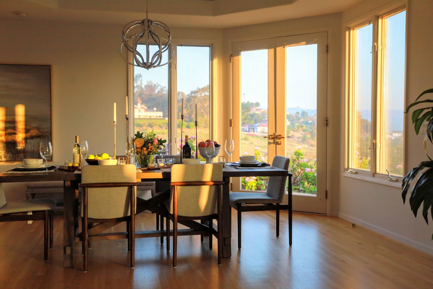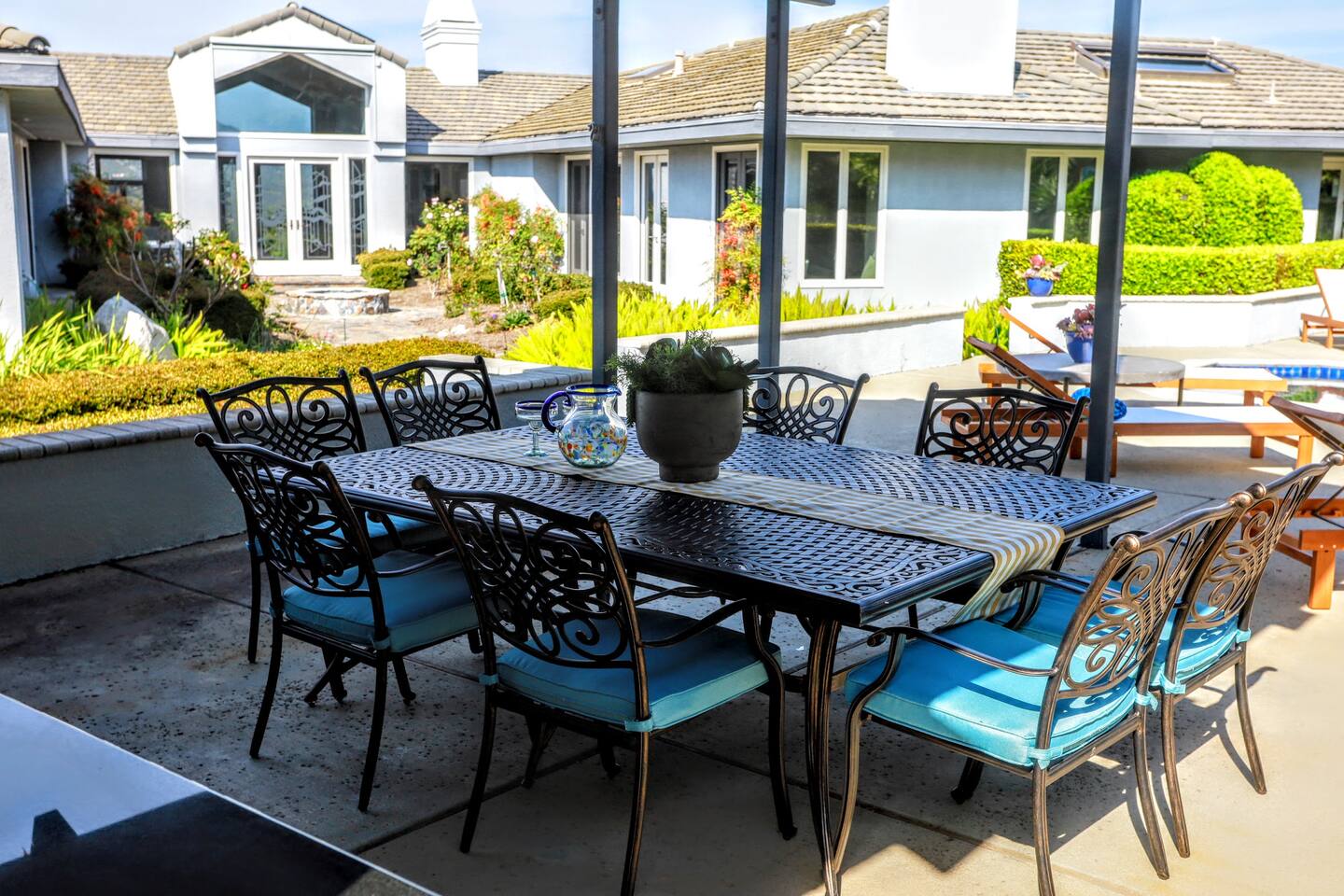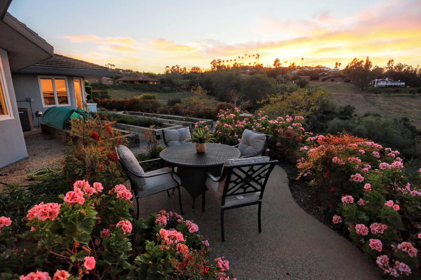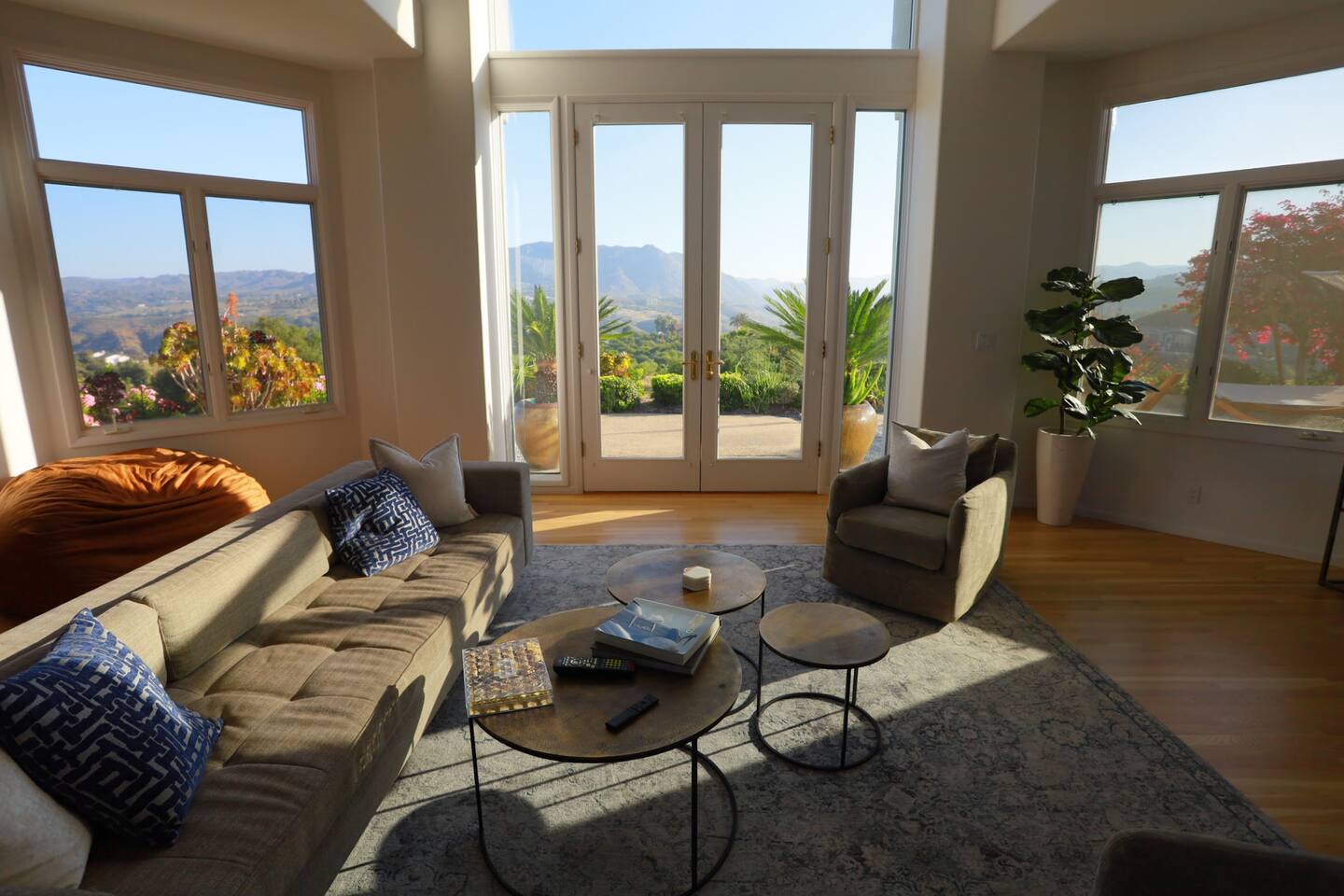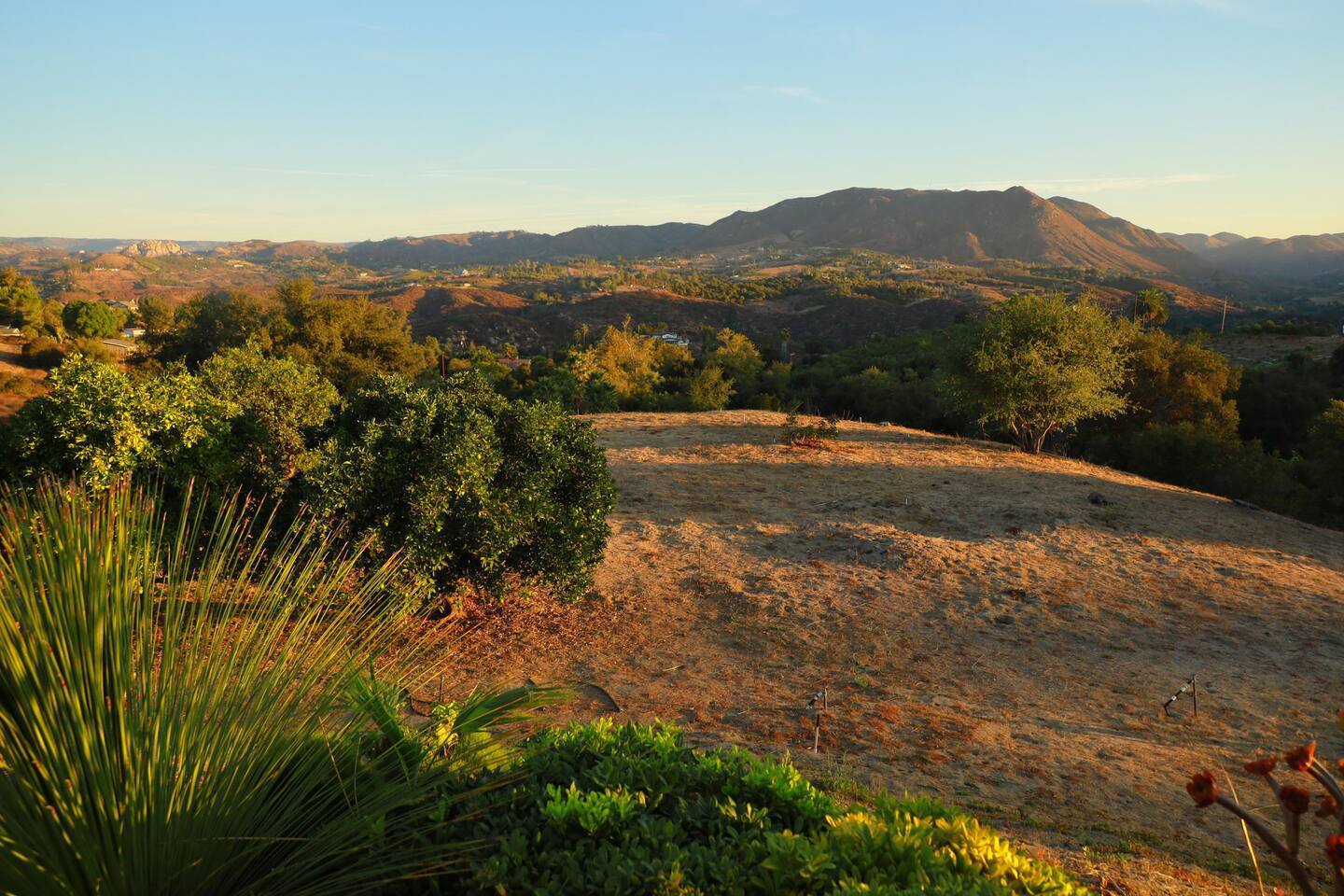 Pick fresh citrus from the orchard for your morning juice. Practice yoga in our expansive living room with panoramic views of the De Luz mountains. Lounge in the sun by our sparkling pool, surrounded by palms and plumeria. Step out your door onto the Santa Margarita River Trail, with blooming wildflowers, shaded riverbanks and hidden truffles. Toast marshmallows in the backyard chiminea as the sun sets. Fallbrook is one of Southern California’s last rural enclaves. Secluded and stunning, yet still close to everything -- wine tours, beach days, hiking, golf and pickleball, or a trip to the city. ★ WHAT MAKES OUR HOME SPECIAL • Château-inspired architecture by Colbourn Currier Noll with sunlit Versailles-style courtyard • Half-Olympic heated saltwater pool + oversized 10-person spa (both heated free) • 3,800 sq ft estate on 4 private acres surrounded by citrus and vineyards • Chef’s kitchen: 6-burner range, double ovens, Sub-Zero fridge, wok + grill • Direct access to the Santa Margarita River Trail • Ideal for weddings, wine weekends & multigenerational retreats 🏡 THE ESTATE Bedrooms (up to 15 overnight guests): • Master: King bed, optional queen bean bag + crib | 800 sq ft bathroom (bridal prep dream) | tropical palm garden and pool views • Bedroom 2: Two queens + optional bean bag | En-suite bathroom | 65" Frame TV | valley views • Bedroom 3: King + queen Murphy bed | En-suite bathroom | garden and valley views • Bedroom 4: Full-over-queen bunk (top: 1 person, 180 lbs max) | private bathroom | valley views • Living room: Two queen bean bag beds | 85" Frame TV | ultimate panoramic views Living & Entertaining: • Open living/dining with French doors to front courtyard, back yard with panoramic mountain views. • Indoor dining for 12+ • 85" and 65" TVs (Disney+, Hulu, HBO Max) • Board games and toys • 3 gas fireplaces (please ask before lighting) Outdoor front yard and pool: • 5,000 sq ft poolside patio with loungers, canopy daybed, tropical palms • Outdoor dining for 12+, gas BBQ grill and outdoor kitchen under the lanai • Ping pong, pool table and lounge under our sheltered wisteria lanai Outdoor back yard: • Gas chiminea and chair circle for cozy evenings, fireside chats and s'mores • Mature orange and lemon trees (pick as much as you like) • Large open space for ceremonies • 4 acres for exploring • Hiking & mountain biking trails at your door, leading to the Santa Margarita river. Sustainability: • 40 kW solar & electric pool heat pump • EV charger - free and convenient for your use 🏊 POOL & SPA Our half-Olympic size lap pool is larger than most hotel offerings, and stunning when sparkling in the sun. Saltwater feels soft compared to the ocean or chlorine pools -- perfect for soaking away stress. The pool is regularly 80–85°F in summer and fall, and heated free to a refreshing 75°F in winter. Our adjacent 104°F spa — as big as many plunge pools and seating 10 — is available for warm-ups. Additional pool heating above 75°F is available for $40/degree with advance notice. 💍 WEDDINGS & EVENTS With its panoramic vineyard and valley views, expansive back yard space and formal courtyard, the estate is perfect for intimate weddings and celebrations. • Up to 60 guests, 12 vehicles maximum • Bridal prep: 800 sq ft master bath • Ceremony: front courtyard or huge open back yard with panoramic views • Receptions: back yard (60 people), poolside or under lanai (30 people), or open up the living room doors on both sides (30 people). • No charge up to 30 guests, $50/person for 31-60 • Quiet after 9 PM, no outdoor music without approval Close to Grand Traditions, Monserate Winery, Los Willows Wedding Estate for larger ceremonies. Many use our villa for wedding party lodging. Connect us with your wedding planner or ask us for catering recommendations. 🍷 WINE COUNTRY GETAWAYS, BACHELOR & BACHELORETTES It's like a California edition of "The Great Gatsby" -- luxurious, private and sophisticated. • 20 min to Temecula wineries and attractions (Ponte, Europa Village, Wilson Creek, hot air balloons) • More personal wine tasting in local Fallbrook wineries (Monserate, Fallbrook Winery). • Homemade Sangria at the Vineyard at 1927 and signature mango margaritas at Estrella’s. • Pechanga casino 15 minutes away • Close enough to San Diego for a night on the town 🏖️ PERFECT FOR FAMILIES Elegant for adults, fun for kids, spacious for everyone. • Enormous lap pool will stun your kids and their friends • Outdoor games in the lanai, 4 acres to explore • Huge living room with up to 4 bean bag beds + Frame TV for the ultimate sleepover. • Chef's kitchen and plenty of room for cooking or catering. • Legoland and Oceanside beach just 30-35 mins! Perfect for multigenerational reunions, quinceañeras, and milestone birthdays. ★ LOCATION, ACTIVITIES & DAY TRIPS Fallbrook sits between wine country, beaches, deserts, and cities—all within an hour. It feels like the last rural bastion in southern California, yet nearly everything can be done as a day trip. • Wine Country (20-30 min): Temecula Old Town, wineries, hot air balloons, Pechanga Casino • North County beaches (30-50 min): Oceanside, Carlsbad, Encinitas, San Onofre, La Jolla • San Diego (50-60 min): Zoo & Safari Park, Balboa Park, SeaWorld, Gaslamp, Mission Beach, Coronado Beach • Orange County (60-90 min): Dana Point, Laguna Beach, Newport Beach • Hiking & Outdoors: Santa Margarita River trail (right out your door), Potato Chip Rock (45 min), Mount Palomar (40 min), Anza-Borrego (90 min), • Golf & Pickleball: Golf Club of California, Pala Mesa Resort, Fallbrook Tennis & Pickleball Club (10-15 min) • Family Fun: Legoland (35 min), Carlsbad Flower Fields (35 min, spring), Disneyland (90 min) Fallbrook boasts excellent local wineries and eateries, 5--15 minutes from our house: • Monserate Winery, Fallbrook Winery, The Vineyard at 1927 --