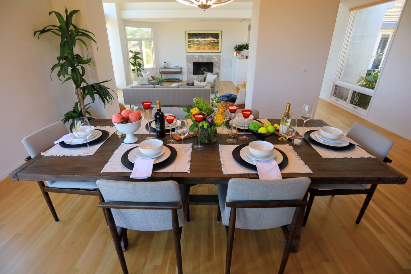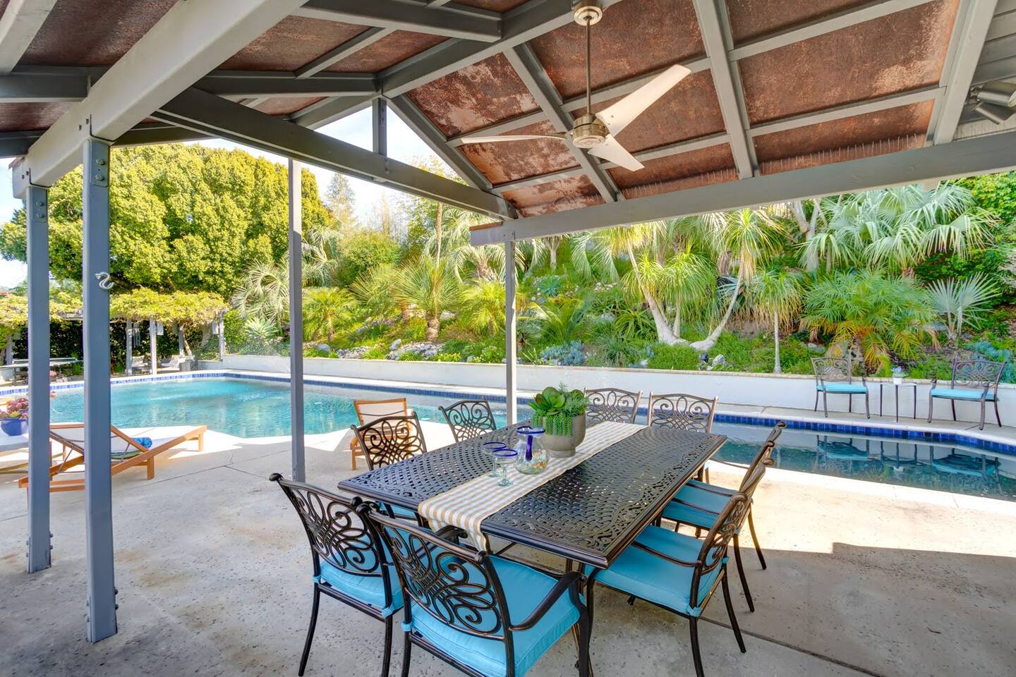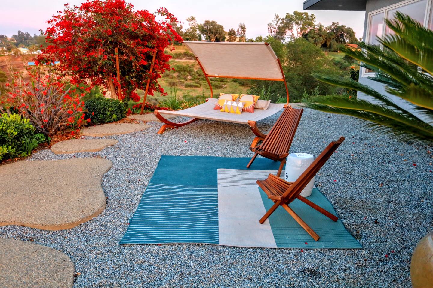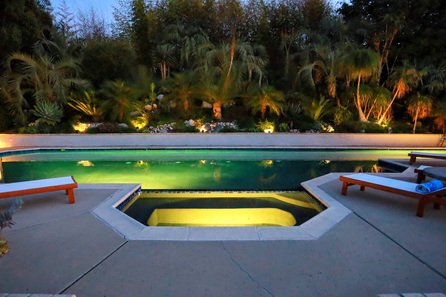 Pick fresh citrus from the orchard for your morning juice. Practice yoga in our expansive living room with panoramic views of the De Luz mountains. Lounge in the sun by our sparkling pool, surrounded by palms and plumeria. Step out your door onto the Santa Margarita River Trail, with blooming wildflowers, shaded riverbanks and hidden truffles. Toast marshmallows in the backyard chiminea as the sun sets. Fallbrook is one of Southern California’s last rural enclaves. Secluded and stunning, yet still close to everything -- wine tours, beach days, hiking, golf and pickleball, or a trip to the city. ★ WHAT MAKES OUR HOME SPECIAL • Château-inspired architecture by Colbourn Currier Noll with sunlit Versailles-style courtyard • Half-Olympic heated saltwater pool + oversized 10-person spa (both heated free) • 3,800 sq ft estate on 4 private acres surrounded by citrus and vineyards • Chef’s kitchen: 6-burner range, double ovens, Sub-Zero fridge, wok + grill • Direct access to the Santa Margarita River Trail • Ideal for weddings, wine weekends & multigenerational retreats 🏡 THE ESTATE Bedrooms (up to 15 overnight guests): • Master: King bed, optional queen bean bag + crib | 800 sq ft bathroom (bridal prep dream) | tropical palm garden and pool views • Bedroom 2: Two queens + optional bean bag | En-suite bathroom | 65" Frame TV | valley views • Bedroom 3: King + queen Murphy bed | En-suite bathroom | garden and valley views • Bedroom 4: Full-over-queen bunk (top: 1 person, 180 lbs max) | private bathroom | valley views • Living room: Two queen bean bag beds | 85" Frame TV | ultimate panoramic views Living & Entertaining: • Open living/dining with French doors to front courtyard, back yard with panoramic mountain views. • Indoor dining for 12+ • 85" and 65" TVs (Disney+, Hulu, HBO Max) • Board games and toys • 3 gas fireplaces (please ask before lighting) Outdoor front yard and pool: • 5,000 sq ft poolside patio with loungers, canopy daybed, tropical palms • Outdoor dining for 12+, gas BBQ grill and outdoor kitchen under the lanai • Ping pong, pool table and lounge under our sheltered wisteria lanai Outdoor back yard: • Gas chiminea and chair circle for cozy evenings, fireside chats and s'mores • Mature orange and lemon trees (pick as much as you like) • Large open space for ceremonies • 4 acres for exploring • Hiking & mountain biking trails at your door, leading to the Santa Margarita river. Sustainability: • 40 kW solar & electric pool heat pump • EV charger - free and convenient for your use 🏊 POOL & SPA Our half-Olympic size lap pool is larger than most hotel offerings, and stunning when sparkling in the sun. Saltwater feels soft compared to the ocean or chlorine pools -- perfect for soaking away stress. The pool is regularly 80–85°F in summer and fall, and heated free to a refreshing 75°F in winter. Our adjacent 104°F spa — as big as many plunge pools and seating 10 — is available for warm-ups. Additional pool heating above 75°F is available for $40/degree with advance notice. 💍 WEDDINGS & EVENTS With its panoramic vineyard and valley views, expansive back yard space and formal courtyard, the estate is perfect for intimate weddings and celebrations. • Up to 60 guests, 12 vehicles maximum • Bridal prep: 800 sq ft master bath • Ceremony: front courtyard or huge open back yard with panoramic views • Receptions: back yard (60 people), poolside or under lanai (30 people), or open up the living room doors on both sides (30 people). • No charge up to 30 guests, $50/person for 31-60 • Quiet after 9 PM, no outdoor music without approval Close to Grand Traditions, Monserate Winery, Los Willows Wedding Estate for larger ceremonies. Many use our villa for wedding party lodging. Connect us with your wedding planner or ask us for catering recommendations. 🍷 WINE COUNTRY GETAWAYS, BACHELOR & BACHELORETTES It's like a California edition of "The Great Gatsby" -- luxurious, private and sophisticated. • 20 min to Temecula wineries and attractions (Ponte, Europa Village, Wilson Creek, hot air balloons) • More personal wine tasting in local Fallbrook wineries (Monserate, Fallbrook Winery). • Homemade Sangria at the Vineyard at 1927 and signature mango margaritas at Estrella’s. • Pechanga casino 15 minutes away • Close enough to San Diego for a night on the town 🏖️ PERFECT FOR FAMILIES Elegant for adults, fun for kids, spacious for everyone. • Enormous lap pool will stun your kids and their friends • Outdoor games in the lanai, 4 acres to explore • Huge living room with up to 4 bean bag beds + Frame TV for the ultimate sleepover. • Chef's kitchen and plenty of room for cooking or catering. • Legoland and Oceanside beach just 30-35 mins! Perfect for multigenerational reunions, quinceañeras, and milestone birthdays. ★ LOCATION, ACTIVITIES & DAY TRIPS Fallbrook sits between wine country, beaches, deserts, and cities—all within an hour. It feels like the last rural bastion in southern California, yet nearly everything can be done as a day trip. • Wine Country (20-30 min): Temecula Old Town, wineries, hot air balloons, Pechanga Casino • North County beaches (30-50 min): Oceanside, Carlsbad, Encinitas, San Onofre, La Jolla • San Diego (50-60 min): Zoo & Safari Park, Balboa Park, SeaWorld, Gaslamp, Mission Beach, Coronado Beach • Orange County (60-90 min): Dana Point, Laguna Beach, Newport Beach • Hiking & Outdoors: Santa Margarita River trail (right out your door), Potato Chip Rock (45 min), Mount Palomar (40 min), Anza-Borrego (90 min), • Golf & Pickleball: Golf Club of California, Pala Mesa Resort, Fallbrook Tennis & Pickleball Club (10-15 min) • Family Fun: Legoland (35 min), Carlsbad Flower Fields (35 min, spring), Disneyland (90 min) Fallbrook boasts excellent local wineries and eateries, 5--15 minutes from our house: • Monserate Winery, Fallbrook Winery, The Vineyard at 1927 --