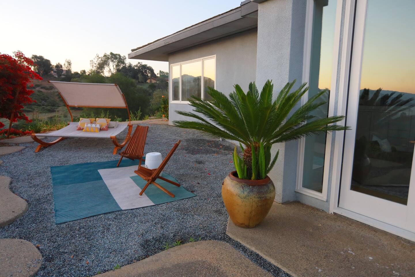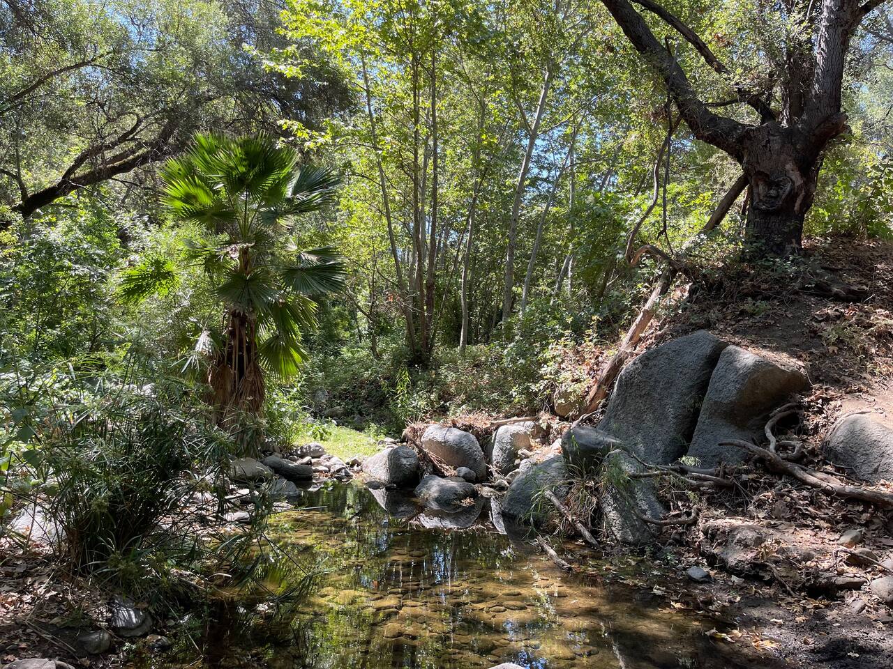 Fallbrook is the rural ecotourism neighbor to the grand wine estates of Temecula. It offers family-operated establishments such as Fallbrook Winery, Monserate Winery, and the Vineyard at 1924. Good local restaurants in Fallbrook include Firehouse Que and Brew, Rainbow Oaks, Casa Estrella, Mariscos El Pacifico and Yumi Sushi. There are many nearby wedding and event venues, such as Grand Traditions, Fallbrook Estate and Los Willows. Golf courses in Fallbrook include the Golf Club of California, Pala Mesa and Rancho Monserate. Fallbrook has generally perfect weather year round. It is not as cold and foggy as the coast, but not as hot and dry as Temecula. Expect temperatures in the 60's - 80's nearly any time you visit. Thanks to North County microclimates, hotter or cooler temperatures are a quick drive away. Specialty plant nurseries are everywhere, because almost everything grows in Fallbrook. The home is 20 minutes from Temecula old town Front street and 30 minutes from the heart of Temecula wine country. It is also 30 minutes from the beach at Oceanside, and 40-50 minutes to Carlsbad, Encinitas, San Diego, and southern Orange County. Legoland is 35 minutes away, Disneyland is a little over one hour away. Hikes around Mount Palomar and Anza Borrego are also an easy day trip. This is the perfect base for a weeklong SoCal adventure. Our house is the last on a private road north of Fallbrook, overlooking the Santa Margarita River preserve. Enjoy complete privacy and solitude, night skies and wildlife. It is adjacent to the Santa Margarita river trail, which can be accessed directly by foot by heading down the road to the east. You can hike or mountain bike right outside your doorstep to this trail system. As described, while our venue is suitable for small events, it is not good for larger parties. We strictly limit events to under 50 and under 12 cars, due to lack of parking, fire hazards, delicate landscaping and impact on neighbors. Larger groups than this on camera will be evicted mid-stay by police if necessary! Please inquire if you are unsure.