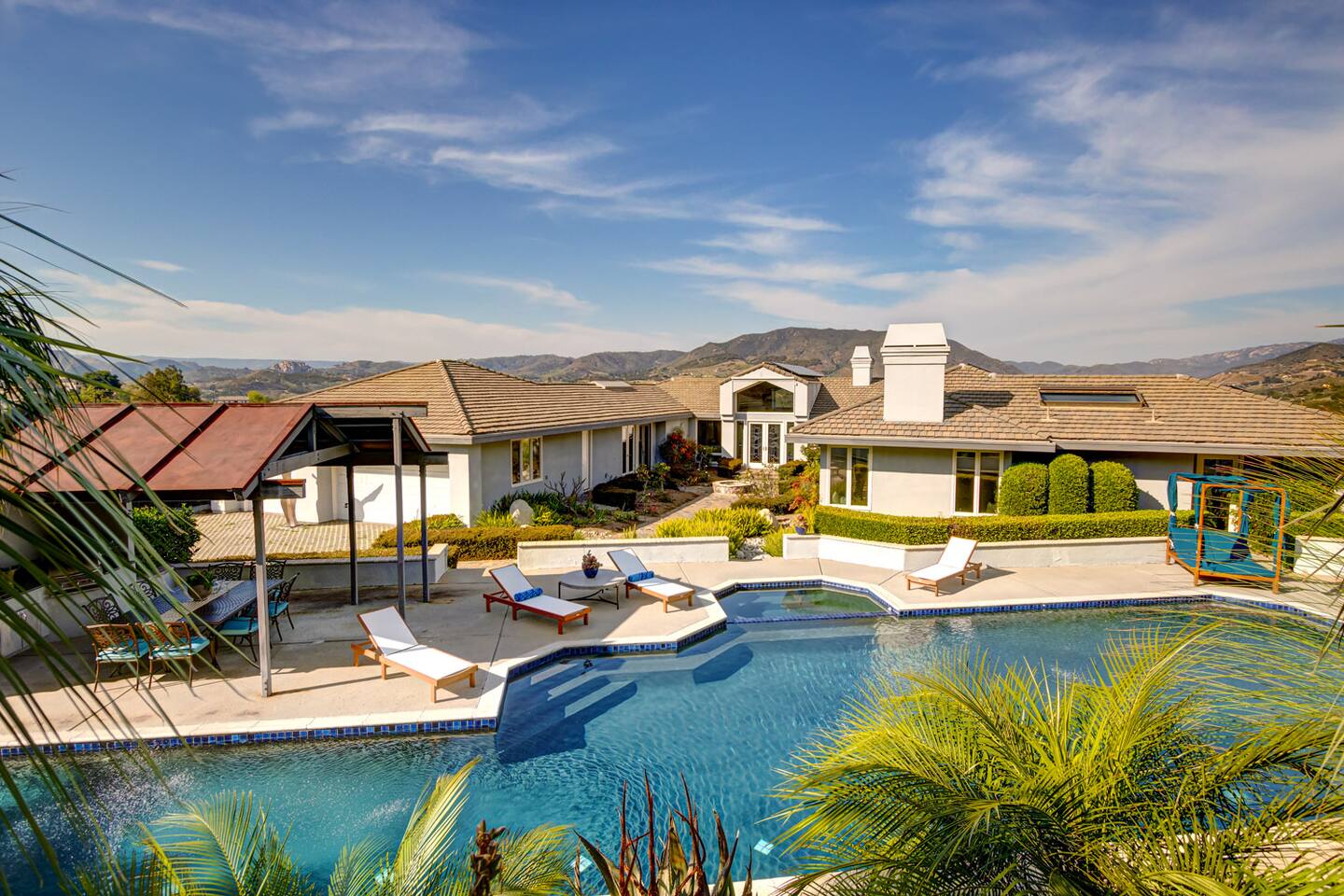 A modern château blending French architecture with California dreaming. For wine getaways, intimate weddings, special celebrations, creative and professional retreats. Set on 4 private acres with mountain, valley, and vineyard views, the estate features a half-Olympic heated saltwater lap pool, oversized spa, and chef's kitchen. Up to 15 overnight / 60 daytime guests. 20 minutes to Temecula wine country, 30 minutes to Oceanside beaches, and easy day trips to Legoland, La Jolla, and San Diego.